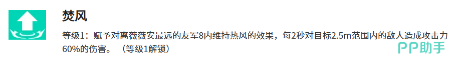 焚风这个辅助技能也挺有意思的。它会自动选择离薇薇安最远的队友,然后给他套上一个持续8秒的热风效果,每2秒对周围2.5米范围的敌人造成60%攻击力伤害。21级之后伤害提升到70%,121级不仅伤害变成80%,还能给目标增加15%攻击力。这个技能适合挂在前排坦克或者近战输出身上,让他们在战斗的时候持续输出范围伤害。