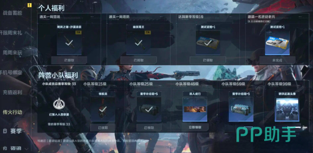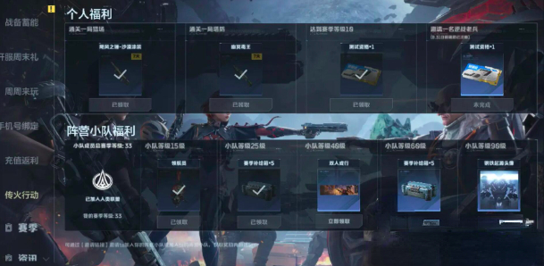 还有一些团队福利,玩家需要和队友配合下完成赛季活动或者是限时活动,为整个小队打出更高分数,和小伙伴们一起瓜分资源补寄,在战场当中如果有突出个人表现,还可以有机会解锁个人福利。
