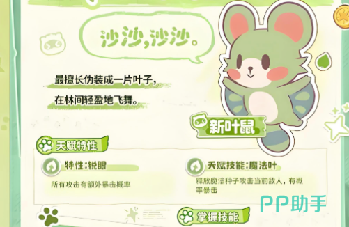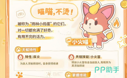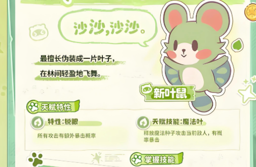 均衡型阵容推荐:新叶鼠、小火喵与水母贝贝。该组合覆盖火、草、水三系,具备良好的环境适应性与持续作战能力。实战中建议由水母贝贝率先施放技能,激活水系场地效果,显著增强后续技能命中率与伤害倍率;随后叠加增益状态,再以小火喵释放“烈焰怒袭”触发燃烧效果,并获得速度加成;最终由新叶鼠发动“树叶风暴”完成高暴击终结。整套流程兼顾压制、续航与收割,面对多属性敌方单位时稳定性突出。