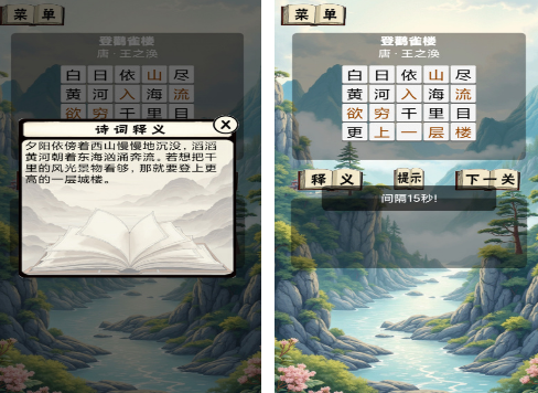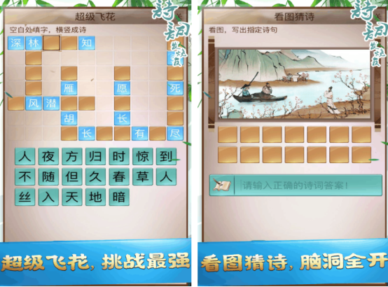 想要让孩子通过这样的游戏锻炼自己在诗词这方面的积累量,或者是开拓思维,这里有着特别简约的风格,还有着古色古香的画面表现,你需要在这里面有一定的诗词积累量,因为在填写文字的时候需要在空白处根据上下内容的提示,填入正确的文字,完成接龙的任务,使每一个诗词都能够被填满的情况下,才可以进入下一个关卡。