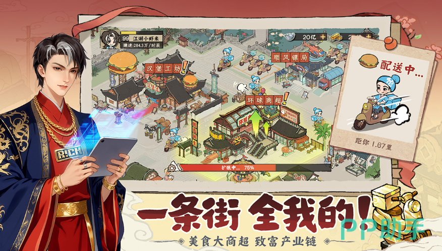 当主店累计足够资金后,即可解锁分店建设功能。游戏设定于一条繁华美食街,支持开设面馆、烧烤摊等多种餐饮业态。不同店铺拥有差异化进货渠道、人力配置要求及营收模型,玩家需结合当前库存、现金流与市场供需关系,审慎决策下一家门店类型。此外,游戏引入“现代经营模块”,如开通外卖服务可带来额外收益流,但同步伴随配送损耗、差评风险等变量因素,考验玩家对风险收益比的综合判断能力。