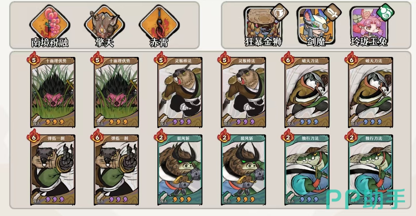 狮子定位为功能型辅助,主责护甲增益与生存保障,装备组合为饮血四件套+踏风逐云,后者专用于为少年角色叠加护甲,神话效果应尽可能贴近200%。前缀优先级为铁衣>养元。武学配置方面,土系携带八张:十面埋伏×2、灵猴棍法×2、破天刀法×2、弹指一刹×2;风系携带四张:烈风斩×2、独行刀法×2。古器固定选用赤阳珠、沧澜链、魍面,三者均直接提升少年攻击力,不可替换。