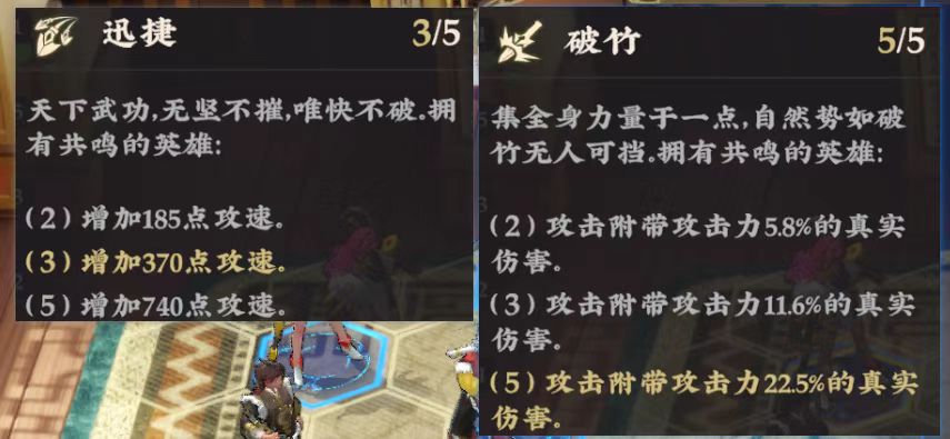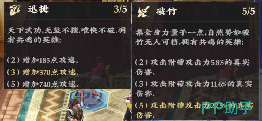 除主动技能外,程应华还天然适配“破竹”与“迅捷”两大羁绊体系。“破竹”随等级成长提供真实伤害加成,满级(5级)时每次普攻可附加22.5%攻击力的真实伤害,有效穿透高防御目标;“迅捷”则专注提升攻速,5级状态下额外增加740点攻击速度,大幅强化技能释放频率与吸血覆盖率。双羁绊协同作用,使其在前排承伤的同时保持高强度持续输出。