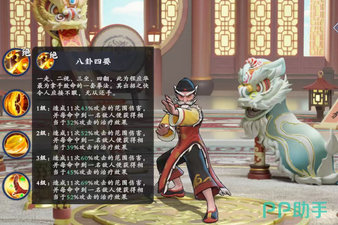 程应华的核心技能“八卦四要”具备显著的复合效能:1级时即可发动11段范围攻击,每段造成自身43%攻击力的伤害,并在每次命中敌方单位时,回复相当于32%攻击力的生命值。这意味着他在密集战局中既能持续压制多个目标,又能通过高频命中实现自我续航。当技能升至4级后,单段伤害提升至69%攻击力,单次命中触发的治疗量同步增强至52%攻击力,进一步放大其站场稳定性与容错空间。