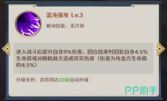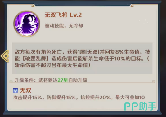 终极技无双飞将为核心成长型被动:每有1名敌方单位被我方击杀,吕布即获得1层【无双】状态,上限10层。每层提供8%最大生命值的持续回复效果,兼具生存与续航价值。当叠加至一定层数后,配合破罡乱舞可触发斩杀判定——对生命值低于10%的目标造成即死效果。此外,【无双】状态还同步提升吕布15%攻击力与15%防御力,并将抗控能力提升至20%,大幅增强其在控制密集环境下的站场稳定性。配合混沌强攻体系,还可转化为真实伤害并加快生命恢复节奏。