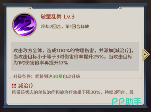 技能释放需注重路径规划与目标选择。在混沌体系构建中,推荐标准六人阵容:吕布、貂蝉、曹操、张飞、诸葛亮、典韦。其中吕布首技能破罡乱舞为范围物理伤害技,基础倍率100%,命中全体敌人后附加【治疗降低】效果,持续两回合。该效果可有效抑制敌方治疗型武将的续航效率,削弱其团队恢复能力。当敌方存活单位≤3时,本技能伤害提升25%;若目标已携带特定减益状态,则额外提升17%伤害倍率;同时,处于该减益状态下的单位,自身治疗或被治疗效果均下降30%,形成双重压制闭环。