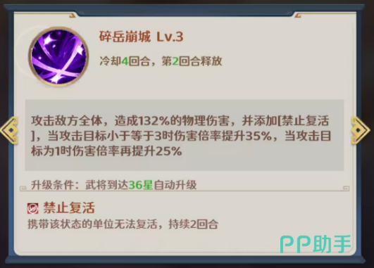 第二技能碎岳崩城为强化版群攻技,物理伤害倍率调整为121%,并新增【禁止复活】效果。该效果对依赖复活机制的辅助类角色具备显著克制作用。当敌方存活单位≤3时,伤害倍率额外提升35%,使其在残局阶段更具威慑力。【禁止复活】状态持续两回合,期间目标无法通过任何方式重返战场。此技能释放时机尤为关键——建议在敌方主力输出被击杀后,立即施加于敌方治疗核心,阻断其战术轮换节奏,加速战局收束。