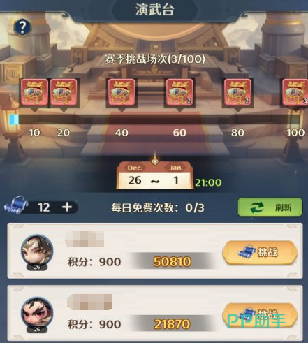 演武场为PVP匹配竞技系统,每日提供三次免费挑战机会,用尽后可使用元宝购买补充次数。匹配机制严格依据当前积分排序,对手强度与自身积分呈正相关。主动发起挑战失败不扣积分,仅防守方被击败时才会扣除积分;战胜高积分对手所获积分更多。每次成功挑战固定获得演武荣耀币,该货币仅限演武场专属商店兑换道具,不可用于其他系统。