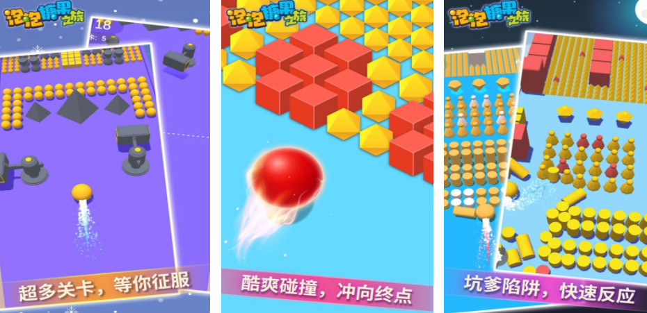 本作以弹球物理为核心,打造高饱和度视觉场景。关卡由多形态障碍物(圆柱、棱锥、不规则几何体等)构成,玩家通过左右滑动控制发射角度与力度,使小球沿预设轨迹运动。目标为击倒尽可能多的障碍单位,同时规避陷阱区域(如黑洞、反弹墙、减速带)。每关障碍布局与属性均不同,需结合碰撞反馈实时调整策略,强调动态预判与微操响应能力。
