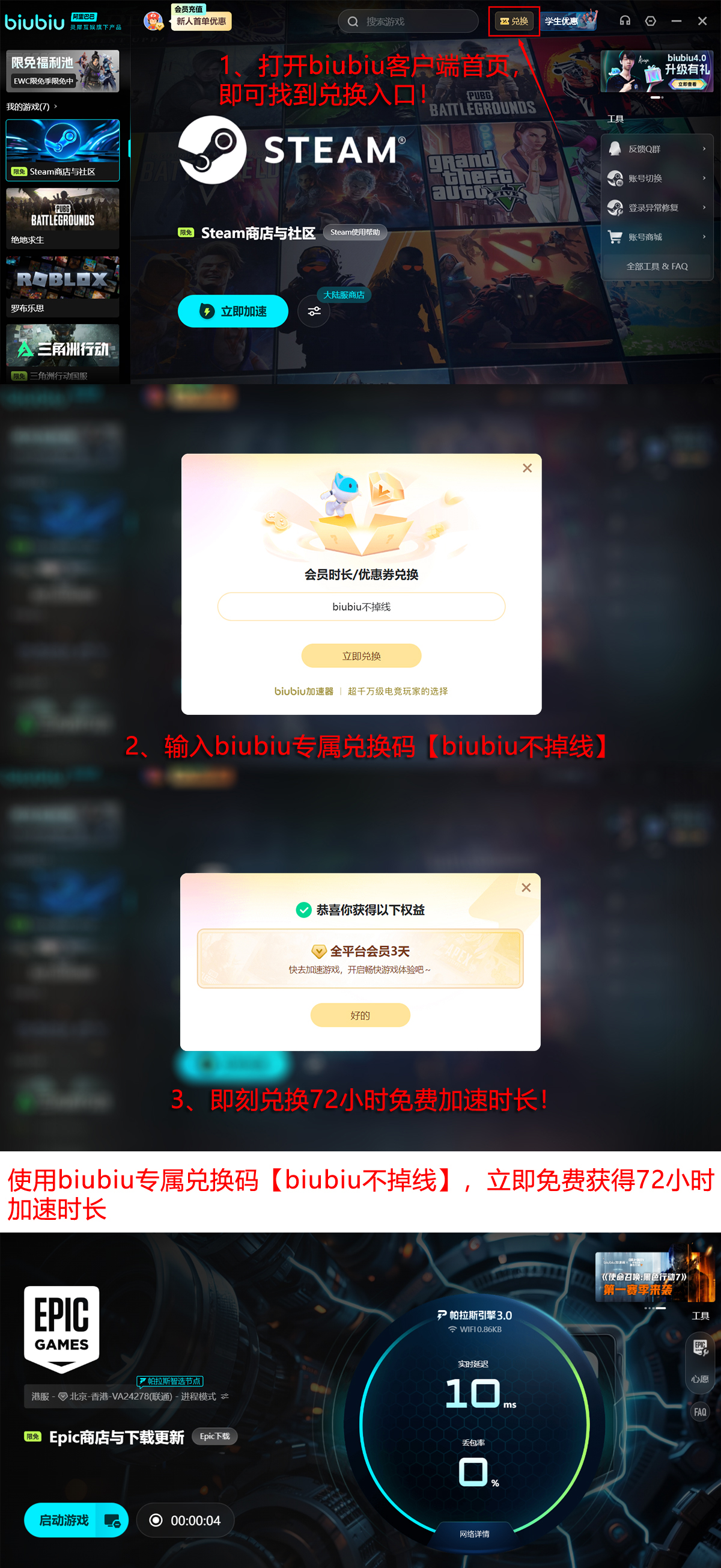 新用户注册即享基础加速时长:完成账号绑定后可获24小时免费使用权;输入隐藏密钥【biubiu不掉线】,额外激活72小时加速权益,合计达96小时无断连体验。所有加速服务均覆盖EPIC平台限免专区,即使未拥有对应游戏,亦可在有效期内完成高速下载与安装。