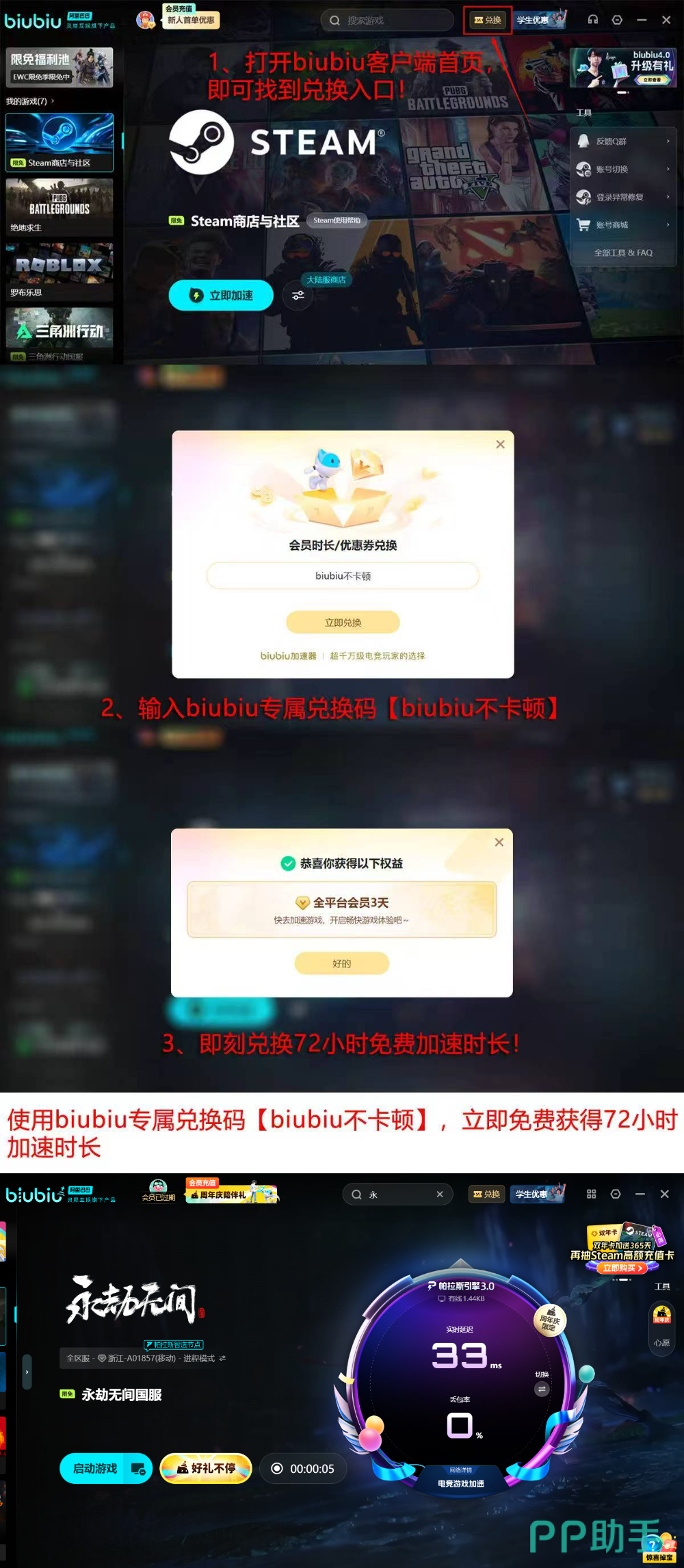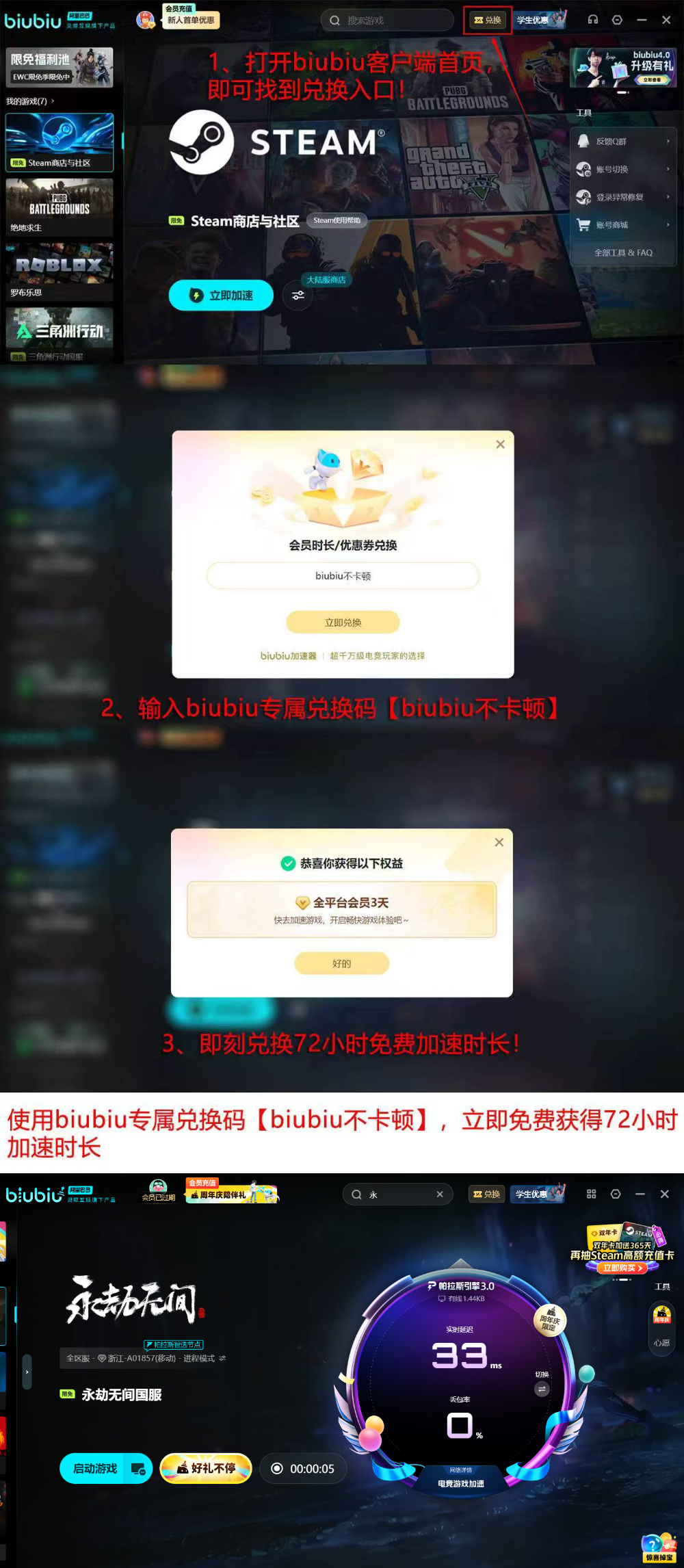 启用加速后,不仅闪退率趋近于零,人物位移异常(如瞬移、卡顿漂移)同步消失;团战中技能释放判定、振刀时机捕捉、连招衔接流畅度均获得实质性提升,关键操作不再因网络波动失效。新用户注册即享24小时全功能免费加速权限,无需绑定支付方式即可体验满配性能;首次使用后,输入专属兑换码【biubiu不卡顿】还可额外领取3天加速时长,累计达96小时,足够完成多轮完整赛季体验。