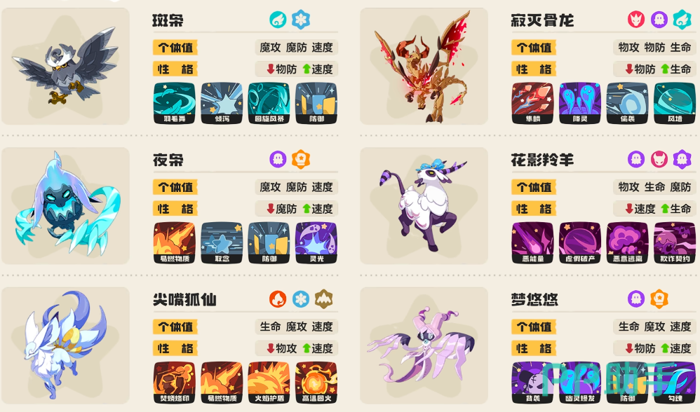 该阵容由六只精灵组成:斑枭、骨龙、夜枭、羚羊、狐仙与梦悠悠。其中幽灵属性占比达100%,形成稳定的属性协同基础。值得注意的是,四只精灵(羚羊、夜枭、狐仙、梦悠悠)均具备高速度面板设计,确保在多数对局中抢占先手权,为后续连锁控能操作提供节奏保障。