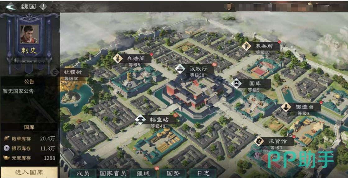 首看基础资源——魏国初始国库显示:粮草20.4万、元宝1288、银币11.3万。该数值为新服开服后实测数据,非模拟或预设值。这意味着玩家注册即拥有充足战略储备:征兵不缺粮、锻造装备不缺银、日常任务消耗有保障,彻底规避新手期“资源断档”困境。再观核心基建:议政厅已达50级,直接提升全资源产量加成;社稷树与辎重站同为40级,前者强化资源产出效率,后者显著优化部队运输与补给流转速度。三项关键建筑均处于高位,表明魏国无需从零建设,玩家可将全部精力投入武将培养与战术部署。