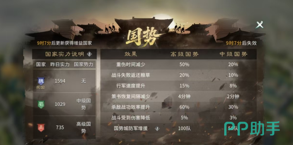 国势方面,魏国当前虽未激活国势效果,但昨日实时战力已达1594,稳居三足之首。距离下一轮国势刷新仅剩9小时,届时将自动获取最高阶国势增益。该状态生效后,部队重伤恢复时间减半;战败时返还20%消耗粮草,大幅降低损耗成本;行军速度提升15%,在资源点争夺、跨城贸易及紧急驰援等场景中占据先机;单日资源采集指令上限提高,守城响应更迅捷,防御容错率显著增强。