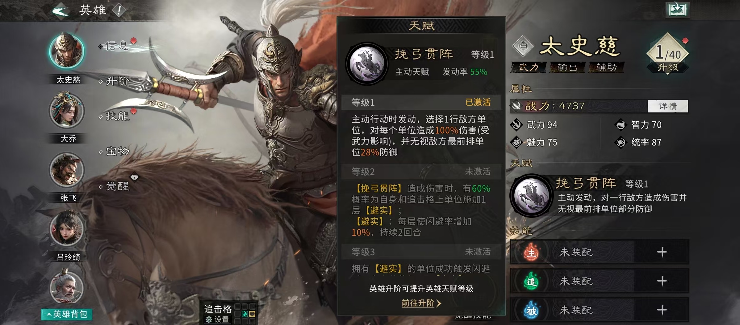 太史慈定位为高机动型物理输出兼功能性辅助。其核心天赋【挽弓贯阵】具备双重战略价值:主动行动时可选定敌方一整行单位发动攻击,造成无视前排单位部分防御的真实倾向伤害;同时,每次命中均有概率为自身及追击格内友军施加【避实】效果——每层提升10%闪避率。更关键的是,当携带【避实】的单位成功闪避敌方攻击时,太史慈将获得【击虚】层数,该效果不仅可抵消目标闪避判定,还能直接提升自身伤害输出。由此形成“增益队友→触发反馈→强化自身”的正向循环链,显著提升队伍生存与持续压制能力。