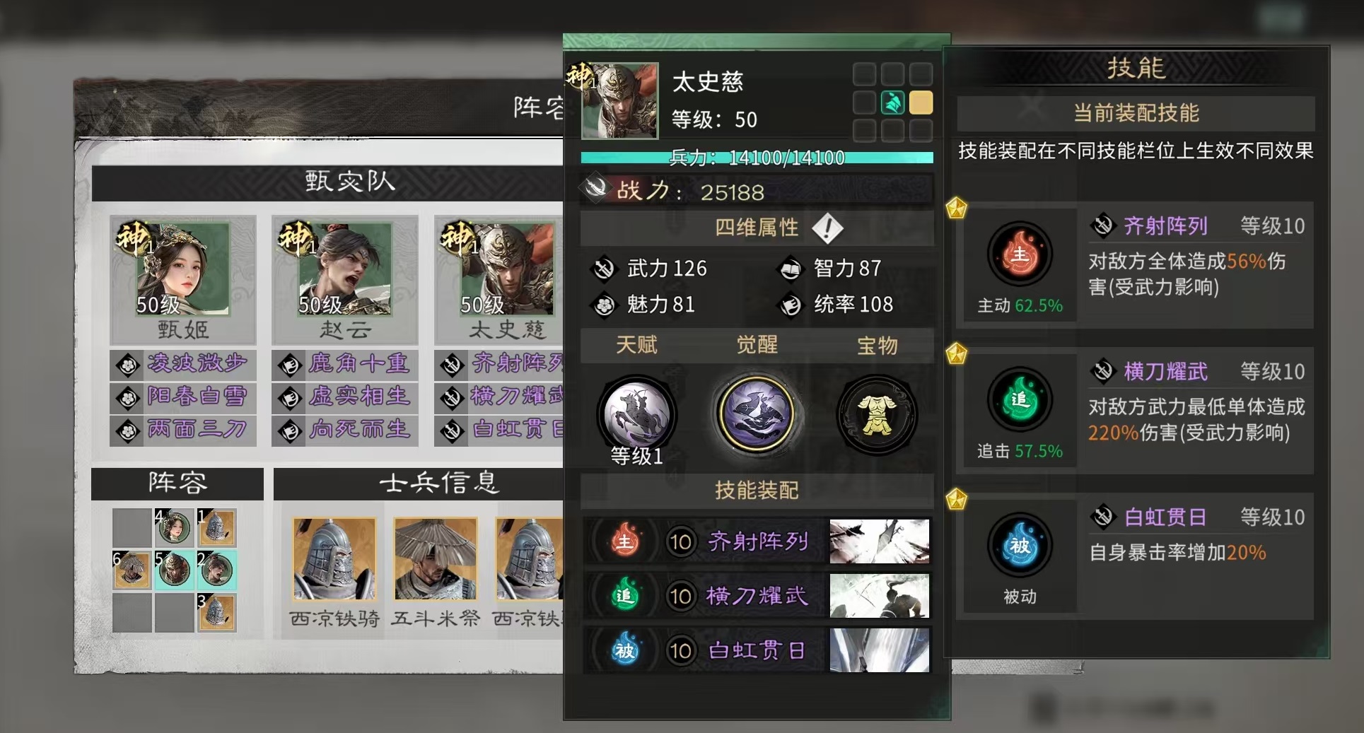 觉醒技方面,太史慈在能量满格时对敌方所有存在单位的行列各释放一次【挽弓贯阵】,并有额外概率重复发动一次。该技能虽无控制或特殊状态附加,但纯伤害结构稳定、覆盖范围广,配合天赋形成的闪避环境,能高效激活依赖闪避机制的队友。典型协同对象为赵云:其觉醒技【龙战于野】需累计5次成功闪避方可触发,对敌方全体造成巨额物理伤害;天赋【七进七出】亦以闪避为前提发动反击。二者搭配可大幅缩短赵云技能启动周期,实现高频爆发与反制压制的战术闭环。