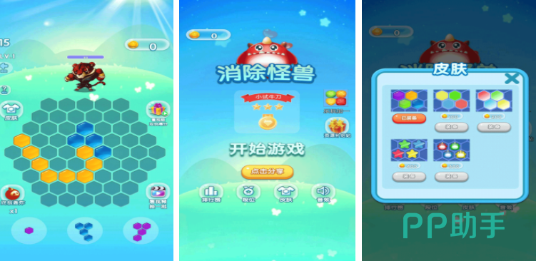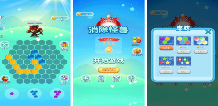 在消除怪兽里面,会设置很多需要玩家战斗的小怪兽,要想开启和怪物的攻击,就可以把这些六边形的方块放入到场景,每次放满一整行或者一整列,都可以释放招式攻击怪物,大家需要把这些不同形状的六边形方块放到合理的位置,这样才能顺利战胜怪物,每一关怪物的类型都不一样,玩家要不断动脑,给这些六边形方块选择最合适的位置。