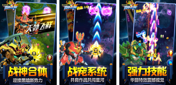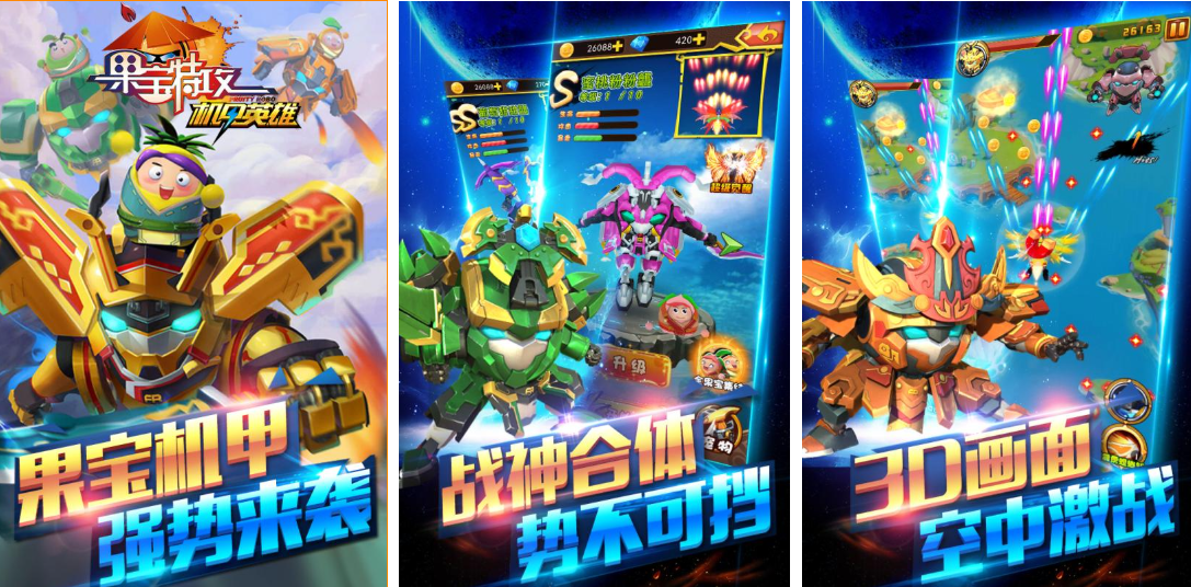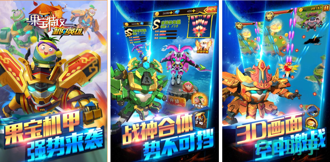 本作也是根据果宝特攻动漫打造的竖屏飞行空战游戏,有着豪华的弹幕特效跟金属感十足的建模,每个机甲战士的造型都对果宝特攻动漫进行了深度复刻,甚至加入了机器人合体战斗的特性增加了战斗能力,还拥有战宠的系统可以辅助大家参与个性化任务,各类强力技能纷至沓来会大大人提升战斗属性。