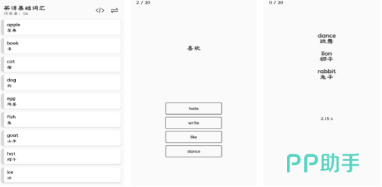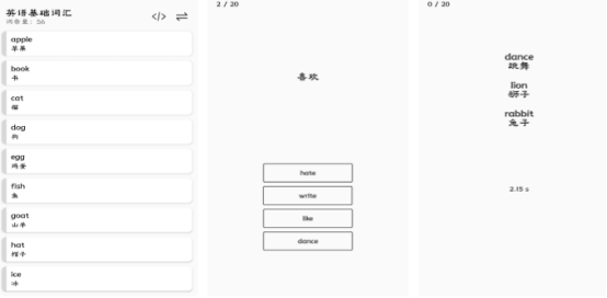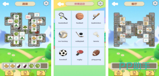按主题分类组织内容,如食物、动物、颜色、交通工具等,每关呈现三组对应图像与文字。操作方式为滑动匹配三个相同元素(如三只猫、三个apple图标),达成消除即验证词汇认知。内置撤销、重排等辅助功能,降低挫败感,增强持续参与度。