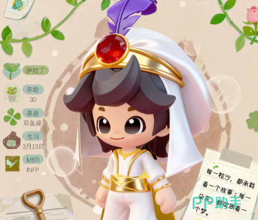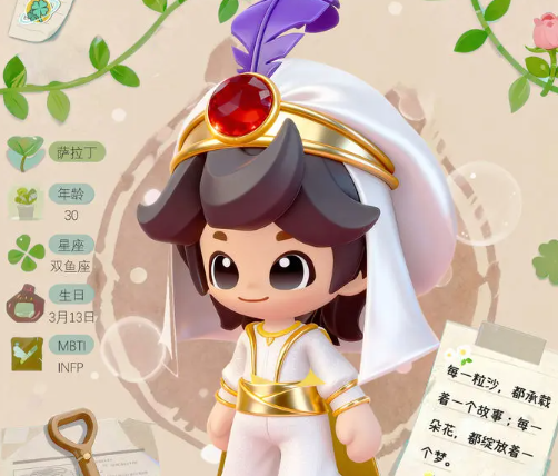 初次对话时,萨拉丁温和沉稳的语调便给人留下深刻印象。悬挂在四叶草商店门楣上的那句箴言,恰是他人生信念的真实映射。他出生于3月13日,属双鱼座,兼具调停者特质,言行间流露出从容儒雅的气质。语速平缓却字字清晰,总能在不经意间引发共鸣。表面看,他只是专注经营一家小型植物商店的爱好者;实则出身阿拉伯皇室,早年接受顶尖教育体系培养,后赴欧洲深造,最终取得植物学博士学位。