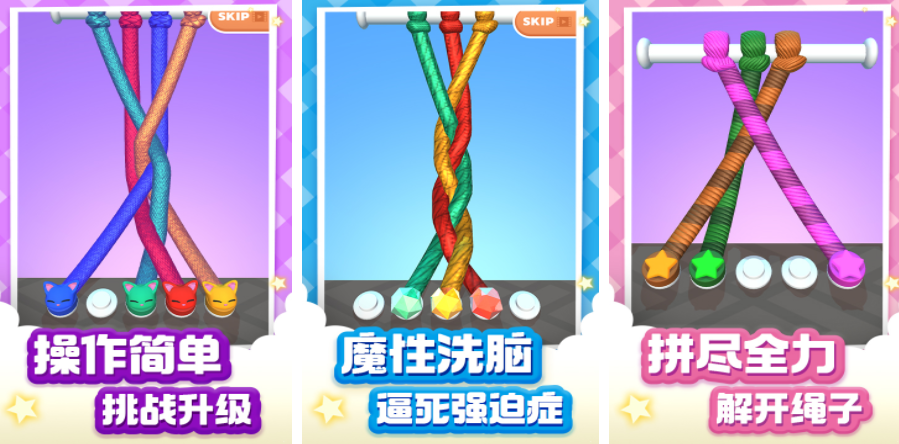 割绳子游戏有哪上面都介绍完了,不只有传统的绳子切割,还会有很多趣味的解绳子玩法,不管哪一个游戏,都需要玩家不断动脑,仔细观察游戏里的设定,相对来说这些游戏是比较简单的,适合玩家来放松自己。