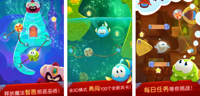 割绳子魔法是割绳子的又一续作,里面会继续采用怪物和糖果的组合,玩家要继续以让怪物吃到糖果为目标,通过合理的绳子切割,让糖果可以顺利进入到怪物的嘴里,和传统作品不同的是,在里面会融入更多的魔法元素,玩家要在解谜的过程中拓展思维,这样才能在这个魔幻世界顺利闯过上百个关卡,还能利用自己的能力对抗邪恶的巫师。