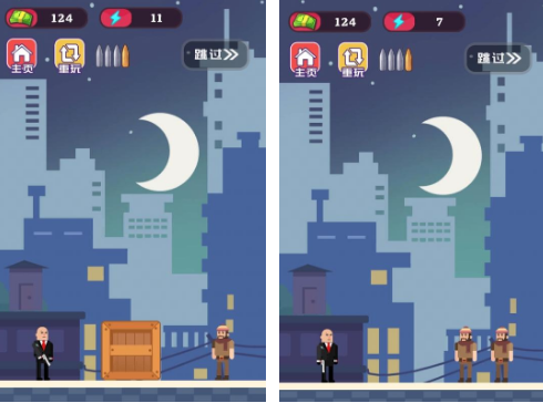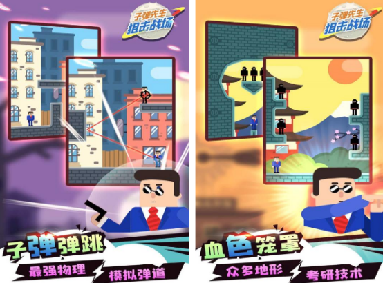 主角“子弹先生”以拟人化弹头形象登场,整体美术风格幽默诙谐。任务场景覆盖城市屋顶、废弃工厂、太空舱等多个主题,敌方单位包含伪装特工、生化僵尸及外星入侵者等多元设定。玩家需在固定点位完成狙击,通过调整风速、仰角与弹道轨迹,在限定弹药数内清除威胁并营救人质。关卡内置多路径解法,鼓励尝试不同射击顺序与反射路线。