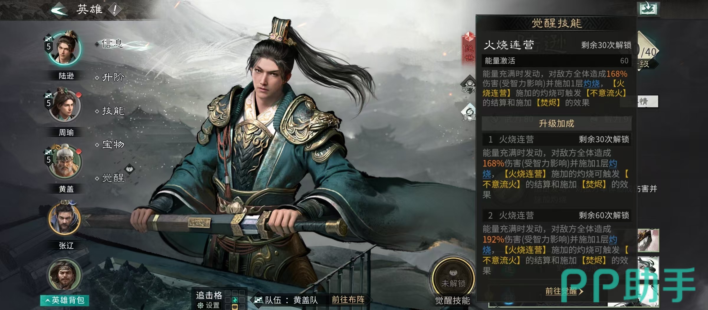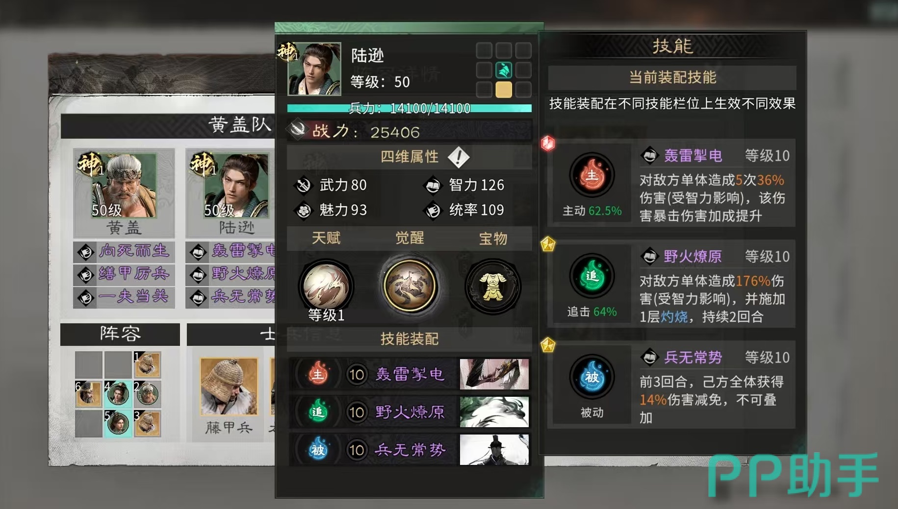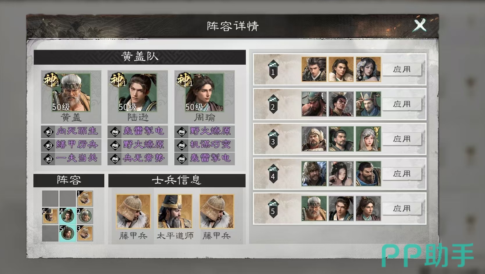 其觉醒技“火烧连营”可对敌方全体造成范围伤害,并统一附加一层灼烧——该灼烧可完整触发天赋的四层结算与焚烬扩散效果,极大提升了AOE灼烧启动效率。因此,陆逊最成熟的配队方案即为“东吴灼烧三巨头”:陆逊、周瑜、黄盖。推荐技能配置如下:陆逊携带轰雷掣电(单体5段高频伤害)、野火燎原(追击型单体灼烧)、兵无常势(被动,提供全队减伤);周瑜搭配野火燎原、机谋巧变、轰雷掣电;黄盖则选用向死而生、缮甲厉兵、一夫当关。兵种配置为藤甲兵×2 + 太平道师×1,布阵上将两名藤甲兵与黄盖置于前排中央,陆逊与周瑜分列中后排,太平道师压轴后置,确保灼烧传递链路稳定、承伤结构合理、输出节奏紧凑。