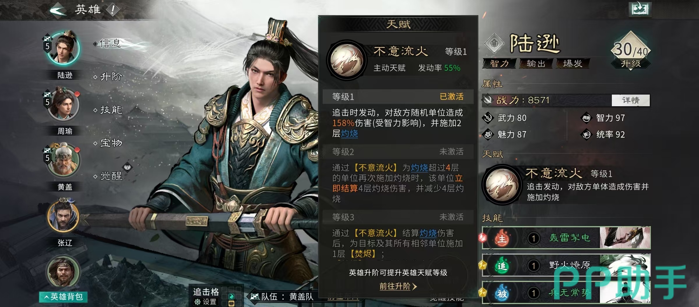 陆逊是三国题材策略手游《三国天下归心》中极具战略价值的核心武将之一。作为红色绝世品质角色,他以超高的智力属性著称,定位为高爆发、强持续伤害的法术输出型将领,尤其在灼烧体系中占据不可替代的地位。本文将从技能机制、实战表现与阵容协同三个维度,系统解析陆逊在当前版本中的实际强度与应用价值。
