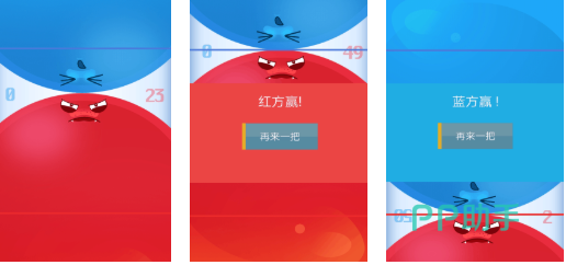 这是一款聚焦双人实时对抗的轻量级手速比拼游戏。双方分别操控红蓝阵营,通过连续点击扩大己方气球体积,利用物理推挤机制将对手推出画面边界以得分。全程无技能冷却、无资源管理,胜负完全取决于单位时间内的有效点击频次。明快的红蓝撞色界面强化视觉对比,节奏紧凑,单局时长控制在数十秒内,适合碎片化对战训练。