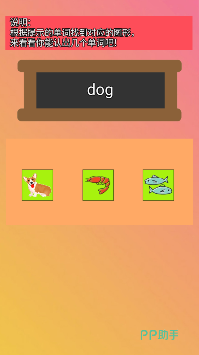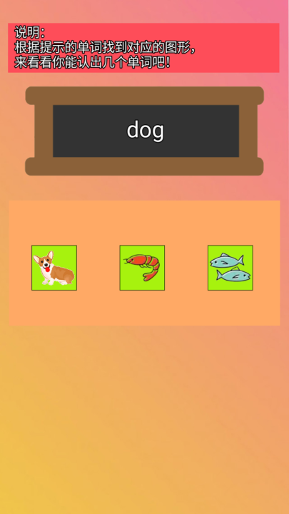 以“词—图匹配”为核心交互形式,强化语义具象化理解。玩家需根据黑板显示的英文单词,在多个图形选项中准确选择对应实物图像。题干词汇均来自小学入门级核心词表,涵盖食物、交通工具、家庭成员等生活化场景。操作无复杂指令,适合一年级至三年级学生开展独立练习或课堂辅助复习,有助于建立稳固的词汇—概念联结。