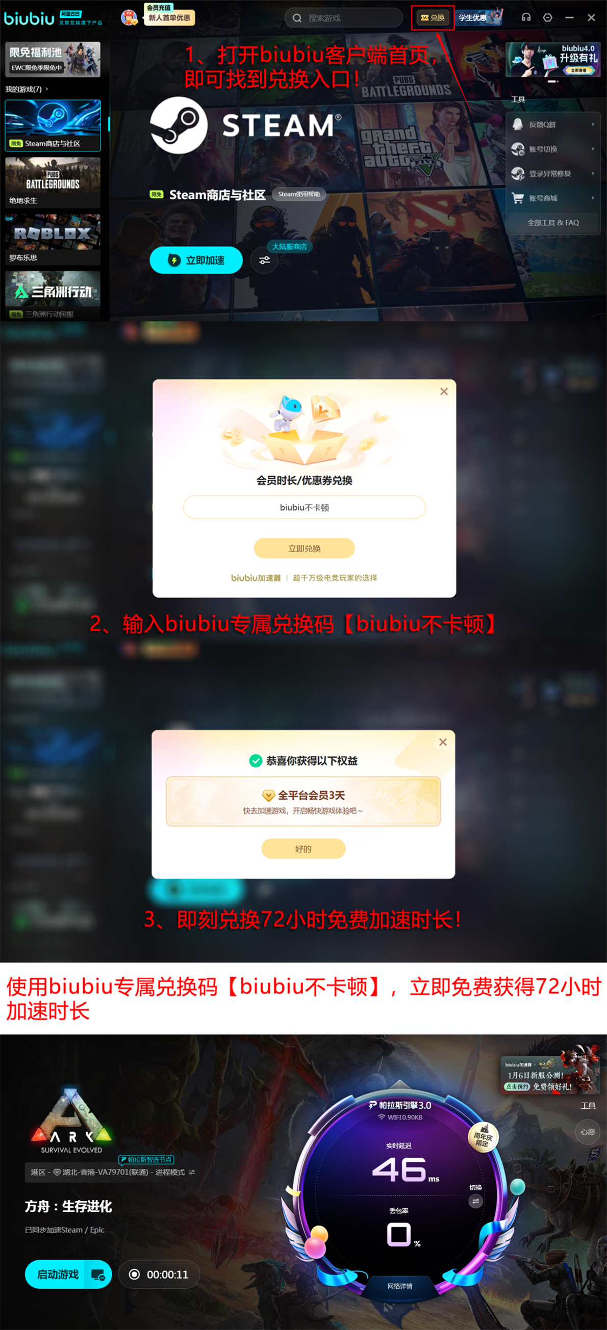 针对弱网用户,biubiu内置智能弱网对抗模块,支持多路并发传输与动态路径优选,在高丢包、低带宽环境下仍可维持会话稳定。当前平台推出限时体验政策:所有账号输入兑换码【biubiu不卡顿】即可获赠72小时高级会员权限;新注册用户首次登录即享24小时免费加速权益。两者叠加可实现连续96小时无门槛试用,充分覆盖问题诊断与深度体验周期。