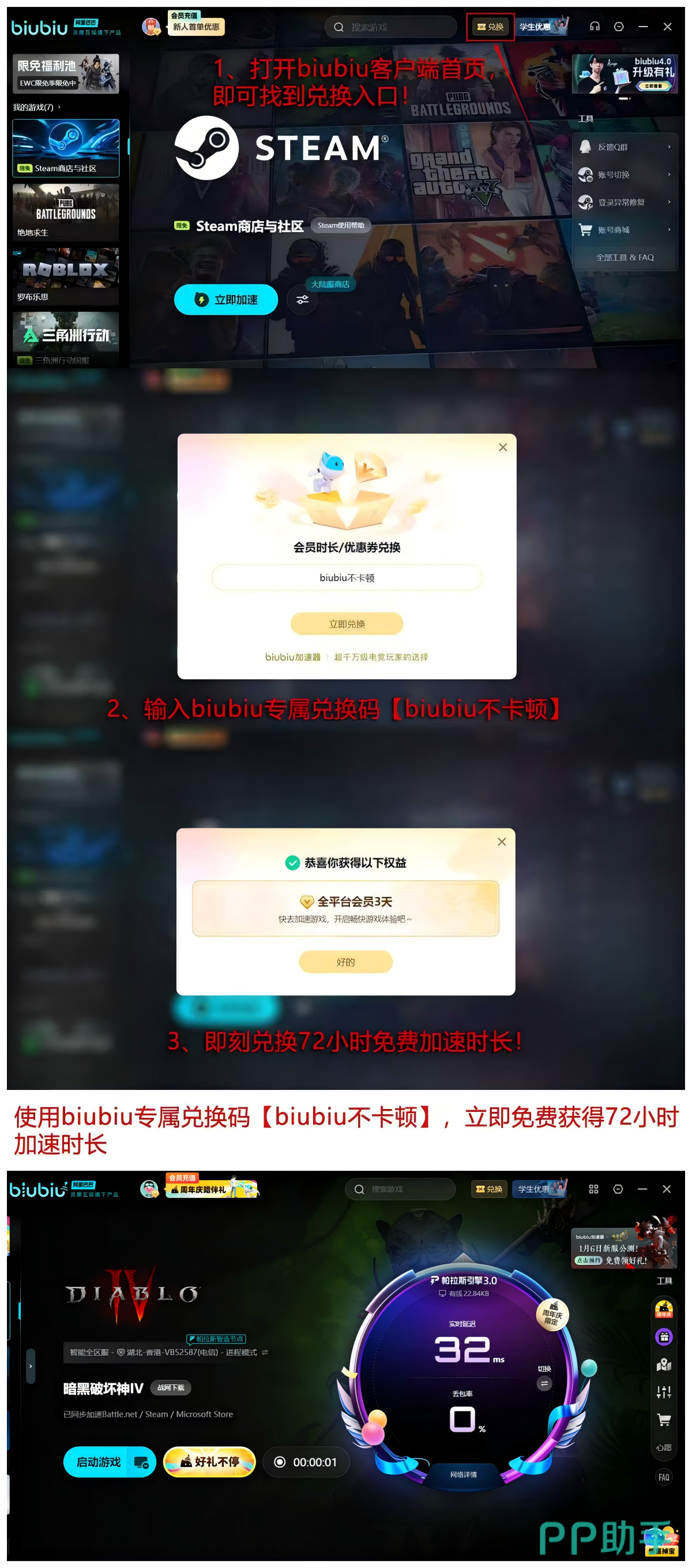 【biubiu不卡顿】72小时轻松GET,新用户固定24小时获取,总计能够得到96小时的加速,支持口令复用机制,同一激活码可在多个账号间流转使用,满足多端登录或家庭共享需求。