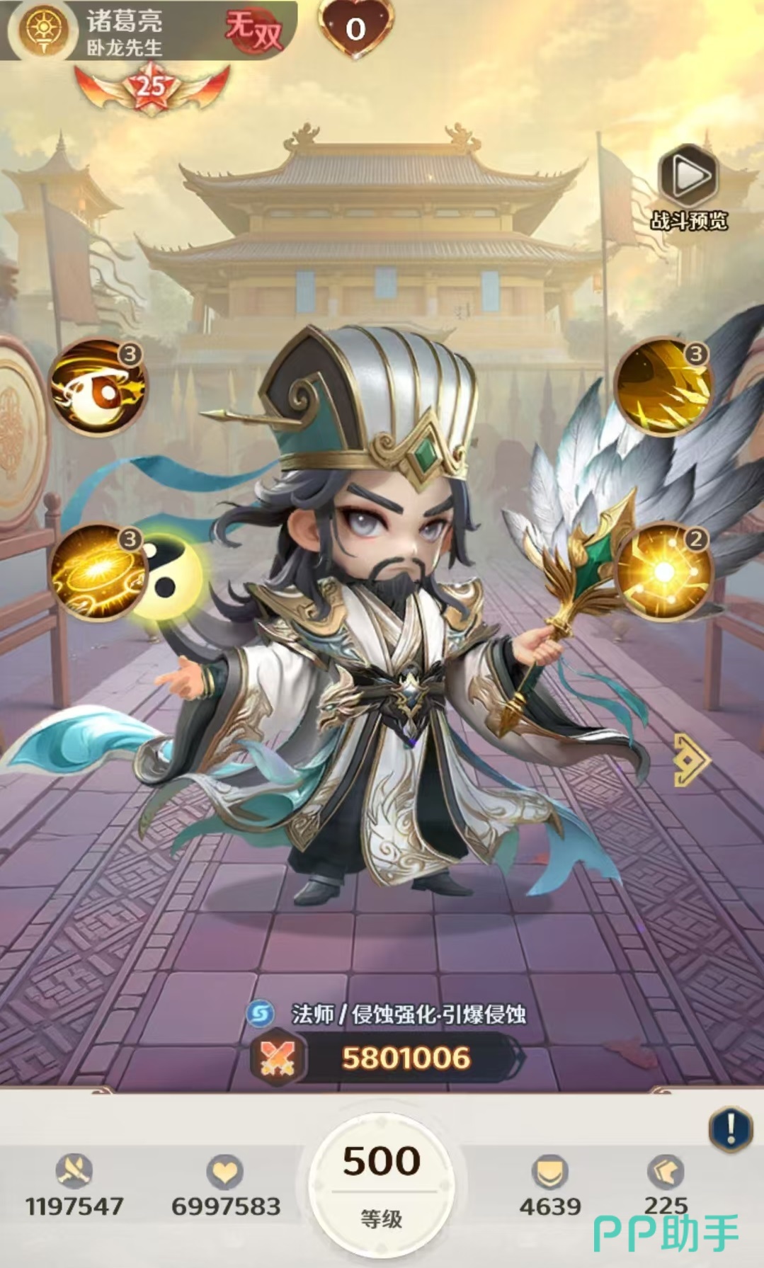 排名第三的无双诸葛亮,定位为法术群攻型核心。其大招可对全体敌人造成大量法术伤害,并强制引爆目标当前所承受的所有“混沌侵蚀”层数,实现多段连锁爆炸。在被动加持下,每次引爆混沌侵蚀时,还会为目标生命比例最低的友方单位恢复一定生命值,兼顾爆发清场与团队续航,是兼具功能性与输出效率的复合型法师。