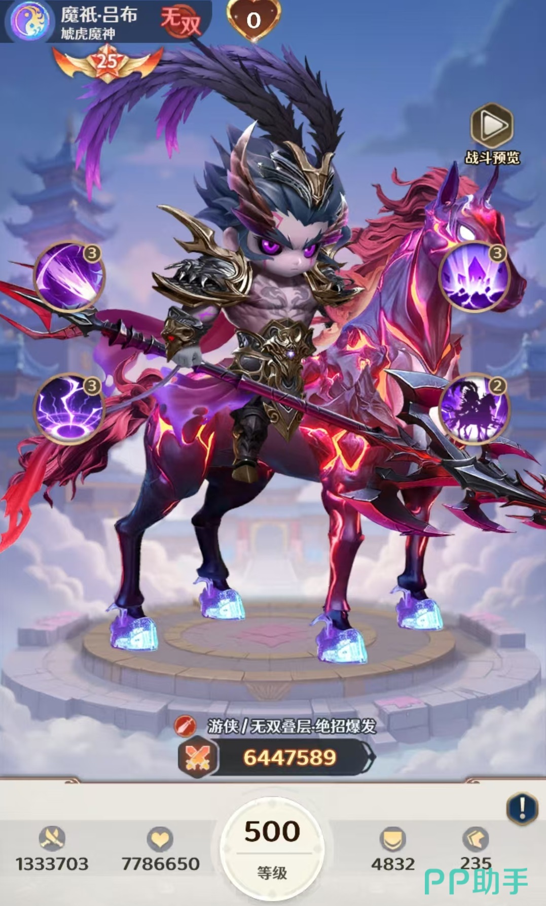 位列强度榜首位的是魔吕布。其核心机制为“无双叠层”——每次释放大招后自动获得1层无双,层数越高,大招基础伤害与附加效果越强。该技能可对敌方全体施加高额物理伤害,并有概率触发“神罚”状态;当敌方存活单位≤3人时,本次攻击额外提升暴击率。配合被动“天下无双”,无双层数可进一步转化为爆发倍率,实现一招清场的压制效果,是当前版本无可争议的顶级主C。