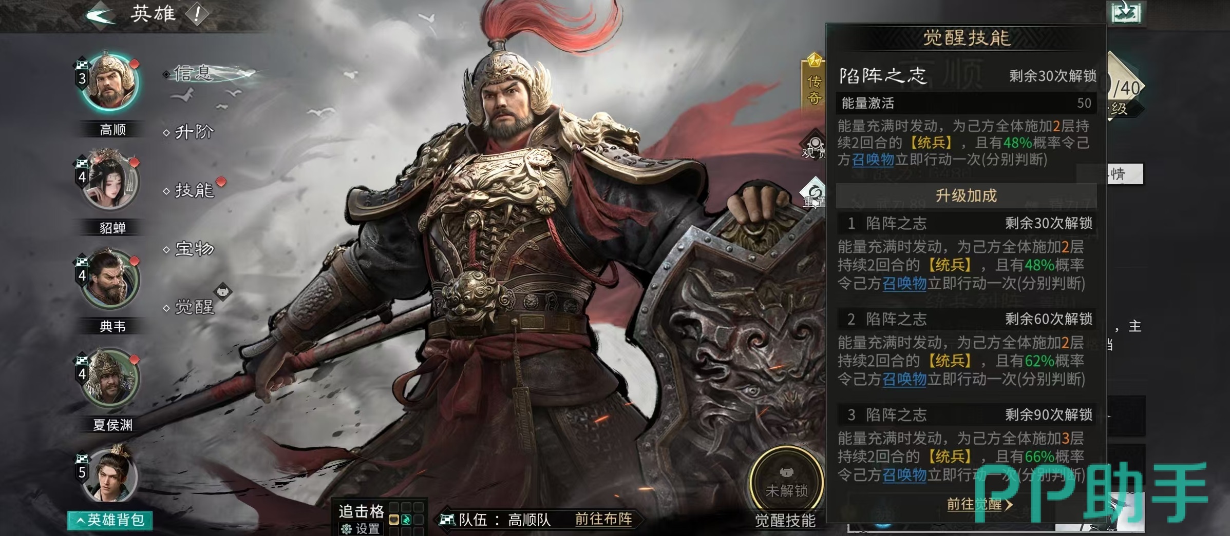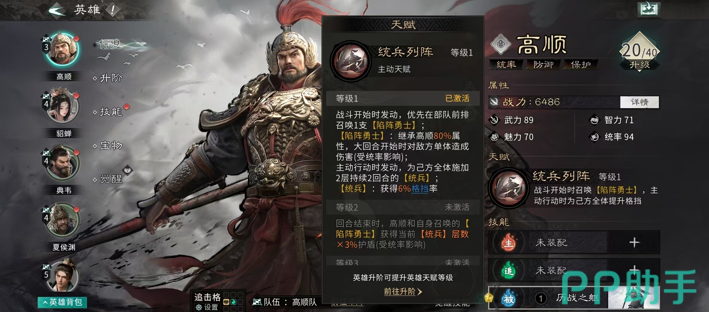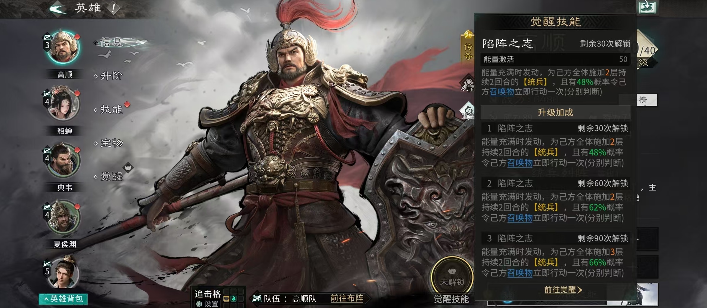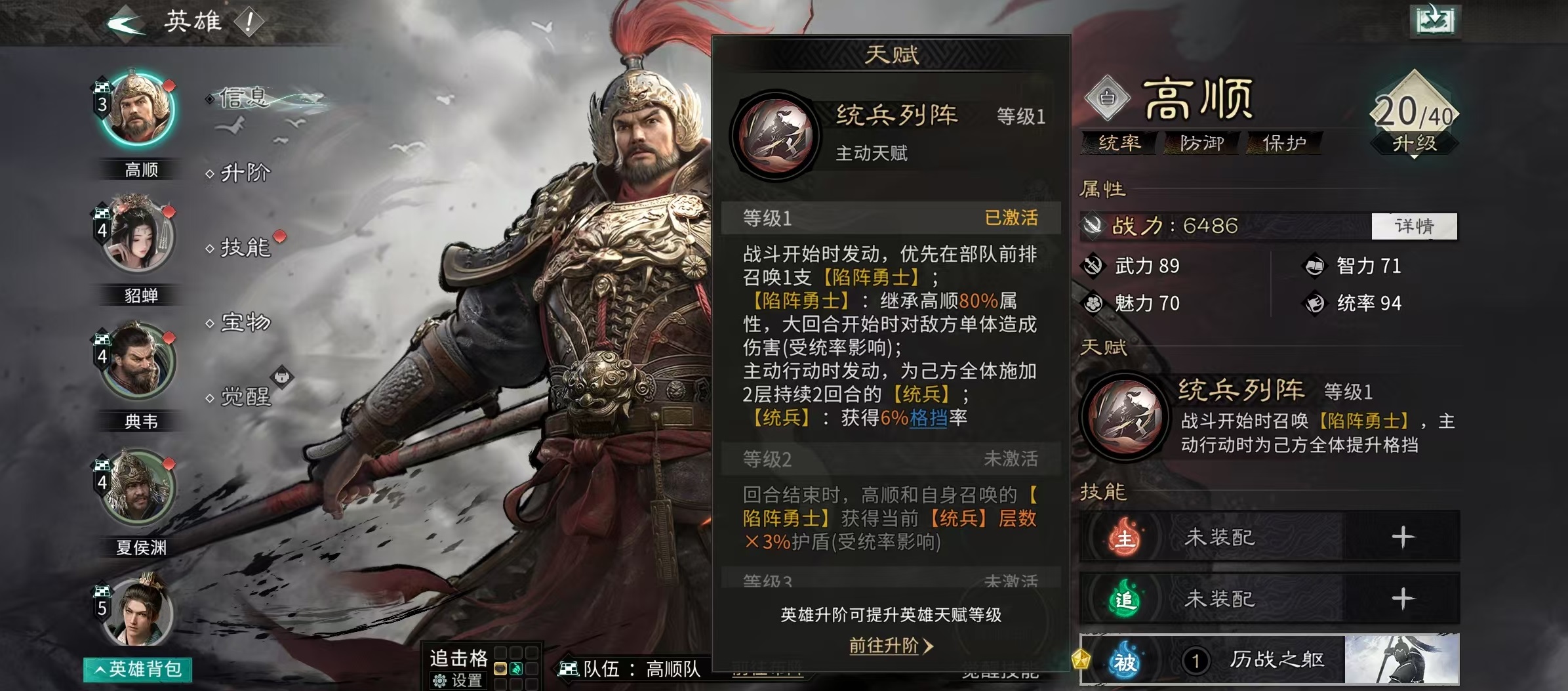 角色定位上,高顺以统率为成长主轴,初始属性即体现其作为前排壁垒的特性。天赋【统兵列阵】提供三层复合机制:首回合在前排生成一名“陷阵勇士”,该单位继承高顺80%基础属性;每大回合开始时对敌方目标发动范围伤害;主动行动时为全体友军施加两层【统兵】效果,持续两回合,每层提升6%格挡率;当高顺或陷阵勇士受到直接伤害时,有概率触发反击,若格挡成功,反击伤害还将获得额外加成。