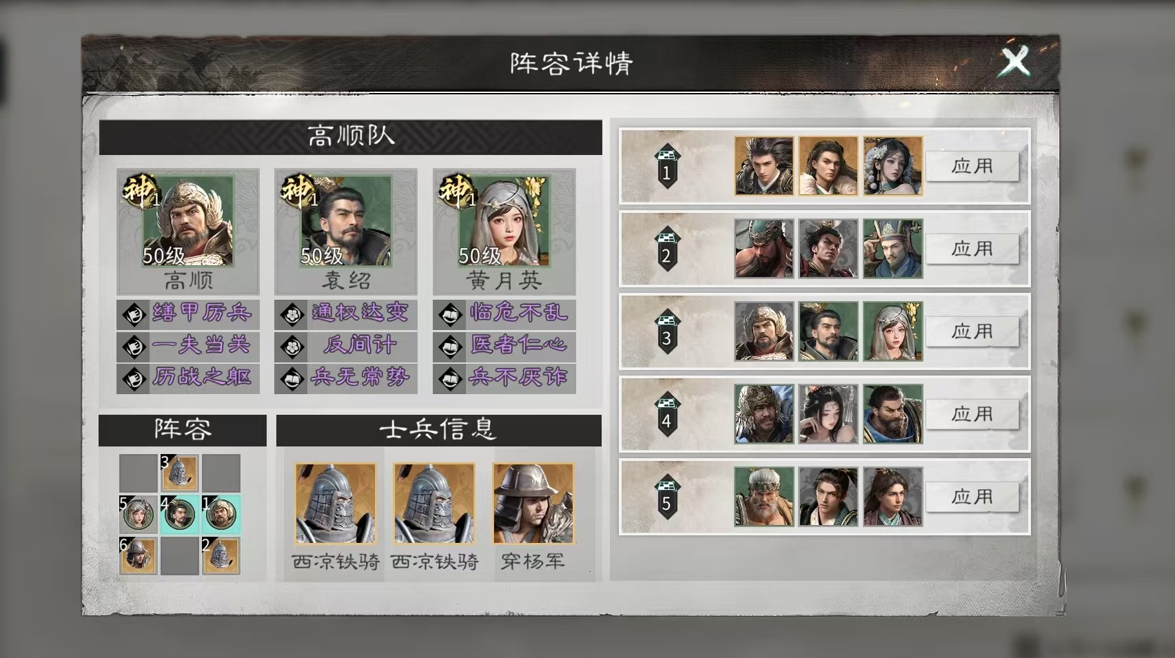 阵容布阵方面,士兵配置选用两名西凉铁骑与一名穿杨军。站位安排为:前排——高顺+西凉铁骑;中排——袁绍+西凉铁骑;后排——黄月英+穿杨军。此布局兼顾抗压能力、召唤物输出密度与技能覆盖范围。
