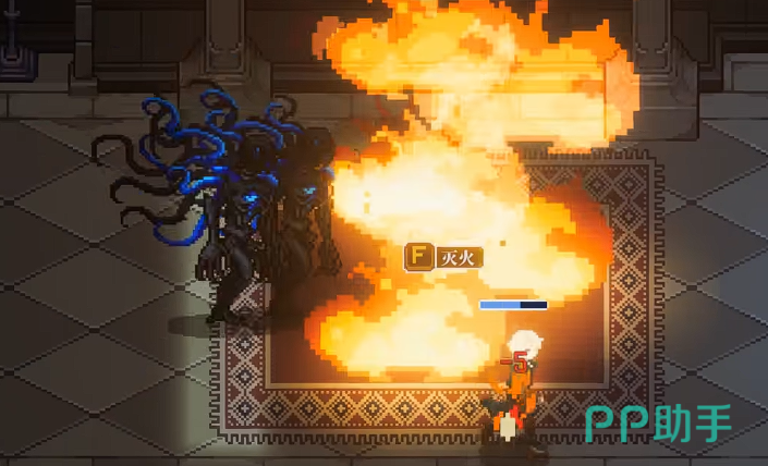死亡瞬间,画面转入一段蓝色梦境过渡,角色意识回归同一城堡,但时间坐标已回溯至过去。此时怪物尚未完成属性强化,不仅战力大幅削弱,更丧失侦测主角位置的能力。玩家可精准定位其所在地毯并执行点燃操作——火焰将直接对其造成致命判定,完成根源清除。