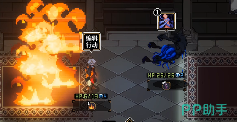 首次点燃地毯后,火焰蔓延并唤醒怪物;进入战斗阶段时,角色每回合承受固定火焰伤害,但敌方因畏火特性始终无法近身攻击,形成安全输出窗口。此时可稳定施放低消耗魔法牌,实现远程压制。