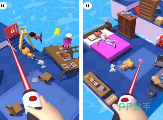 本作高度还原猫咪对光点追逐的天性,构建了一个自由度较高的居家场景。玩家通过拖动激光点引导猫咪跳跃、扑击、翻滚,过程中会触发环境互动反馈——打翻花瓶、踢乱纸箱、撞倒书架等,营造出真实而富有喜剧张力的动态效果。角色包含一只高拟真建模的猫咪及若干NPC人物,强化生活化代入感。