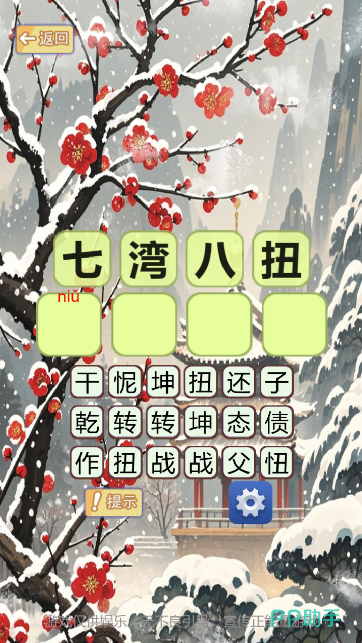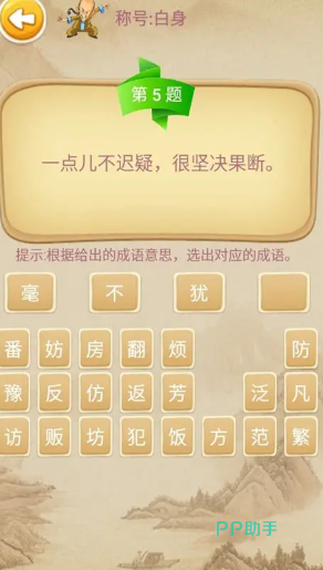 构建古风叙事世界,玩家化身书生角色,通过解答成语相关任务推动主线剧情。例如“破釜沉舟”章节中,需连续答对5道关联题目方可解锁后续剧情分支;NPC提供限时委托任务,完成可获典籍碎片,集齐后合成完整成语典故图鉴,实现故事驱动型深度学习。