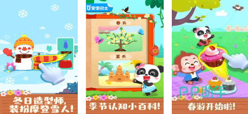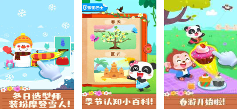 季节概念对低龄儿童而言抽象难解。《宝宝缤纷四季》采用沉浸式场景交互:春日播种、夏日采果、秋日收割金灿灿的稻谷、冬日堆雪人并搭配应季衣着。每个季节模块均嵌入可点击、可拖动的互动元素,辅以温度变化、植物生长等视觉线索,将时间周期、气候特征与生活经验紧密联结,有效替代机械记忆,提升概念内化效率。