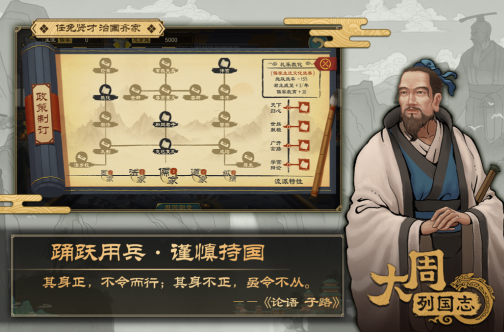 本作是款根据真实战国时期历史开发的军事类手游,军事战争跟历史元素的结合自然毫无违和,创新超前的战争策略理念上手更快,化身军事专家周游列国的过程也会呈现更多惊喜,任务系统多样且环境设定复杂是本作亮点,使用怀旧向的UI风格塑造出真实的春秋战国时代。