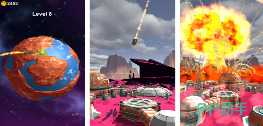 3d星球摧毁类核弹手游,背景是设定在银河系,玩家可以自由的选择建造星球或者是摧毁星球。核心的玩法是使用核弹,针对目标星球去完成精准打击,见证星球从完整到崩解的过程。视觉效果震撼人心,核弹引爆星球时的爆炸光影,就如同是科幻电影一样出色。游戏的自由度比较高,没有固定的任务限制,可以随心所欲的打击目标。