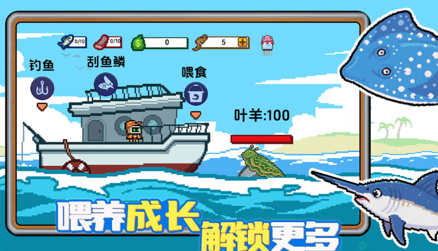 这是款能够乘坐可爱像素小船出门钓鱼的经典神作,像素风的海洋地图和海底生物塑造都十分精致,养鱼以及垂钓等玩法纷至沓来令整个游戏更具魅力,像素画面刻画呆萌生动带来的观赏性也是不俗的,许许多多海洋生物与你互动的流程生动有趣,还可以模拟刮鱼鳞让大家享受当渔民的乐趣。