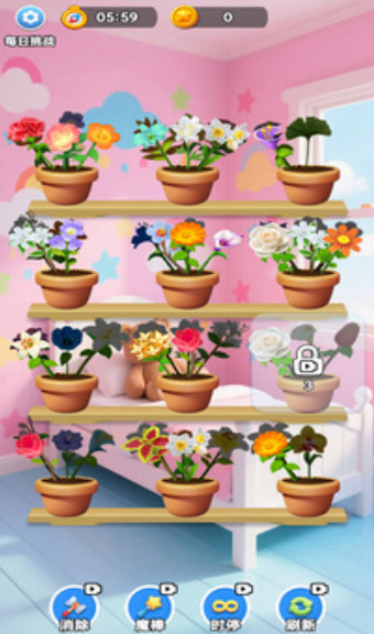 这款游戏复刻了现实中的许多美丽花卉,诸如百合花、玫瑰花等应有尽有。游戏的关卡中花卉们纵横交错,你需要通过改变它们的位置从而促使3个相同的花在一个盆栽里,就能消除它们。游戏的界面以卡通梦幻风呈现,定会让你一看就心动不已。游戏的关卡多,且关关布局不尽相同,才给大家新奇的体验。