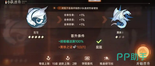 在主界面右侧中央位置,点击菱形图标即可进入小队评级系统。该系统由三大模块构成:评级提升、炼金研习社、学院委托。其中,主线剧情推进、日常历练、副本挑战等绝大多数玩法均可稳定产出历练经验,为段位跃迁提供持续动力。