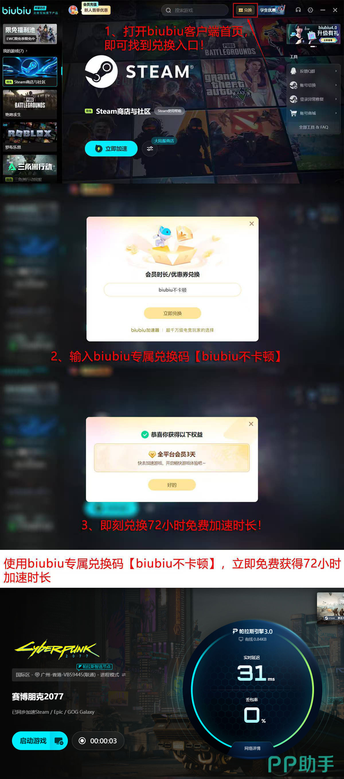 现面向新用户提供限时体验福利:完成注册即可获赠24小时免费加速时长;登录客户端后进入首页“兑换”入口,输入激活码【biubiu不卡顿】,额外领取72小时权益,总计可享96小时(即4天)无限制使用权限。此阶段无需绑定支付方式,亦不设功能限制,便于用户全面评估实际效果。