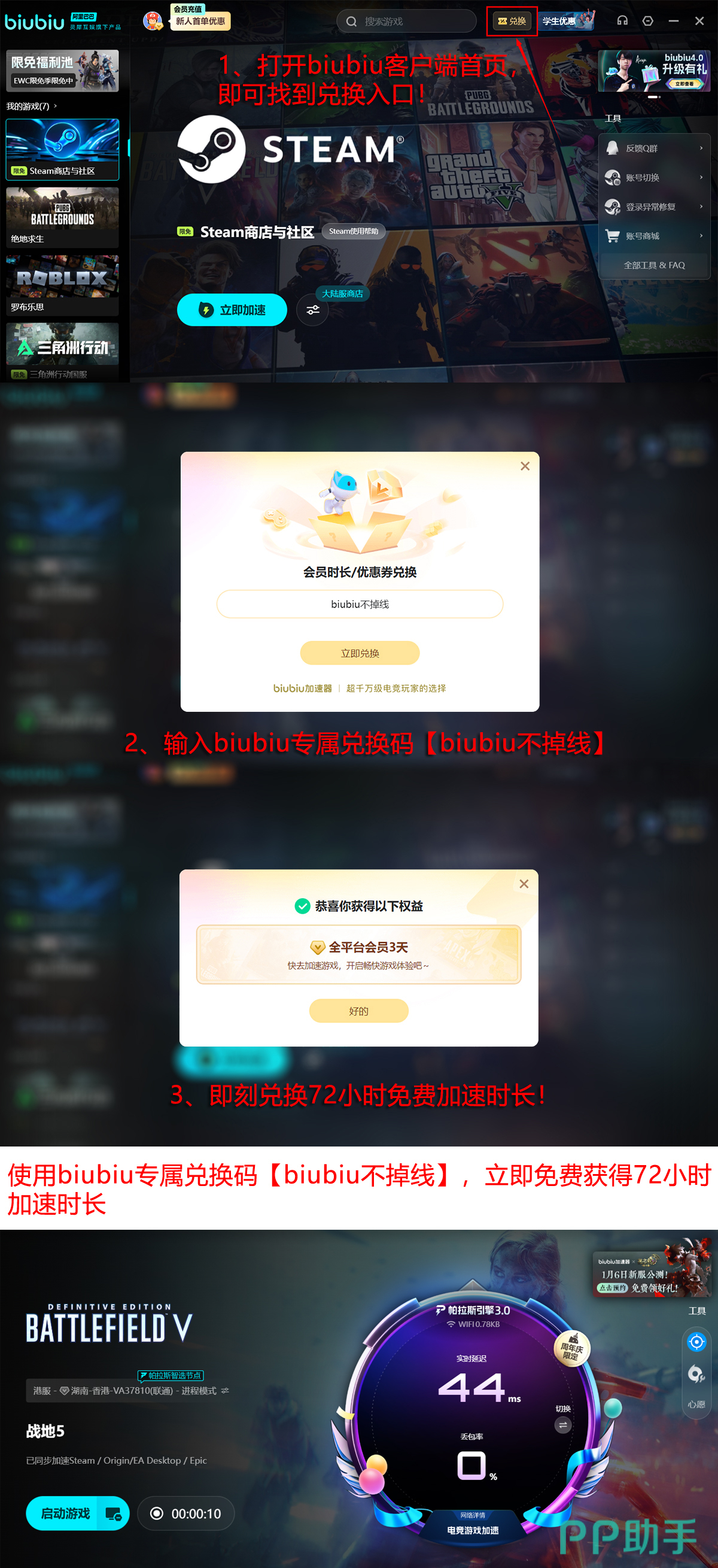 特别提示:新用户注册即赠24小时试用权益;使用专属口令【biubiu不掉线】可额外兑换3天服务,累计享96小时免费体验。该组合权益限时开放,建议及时领取。