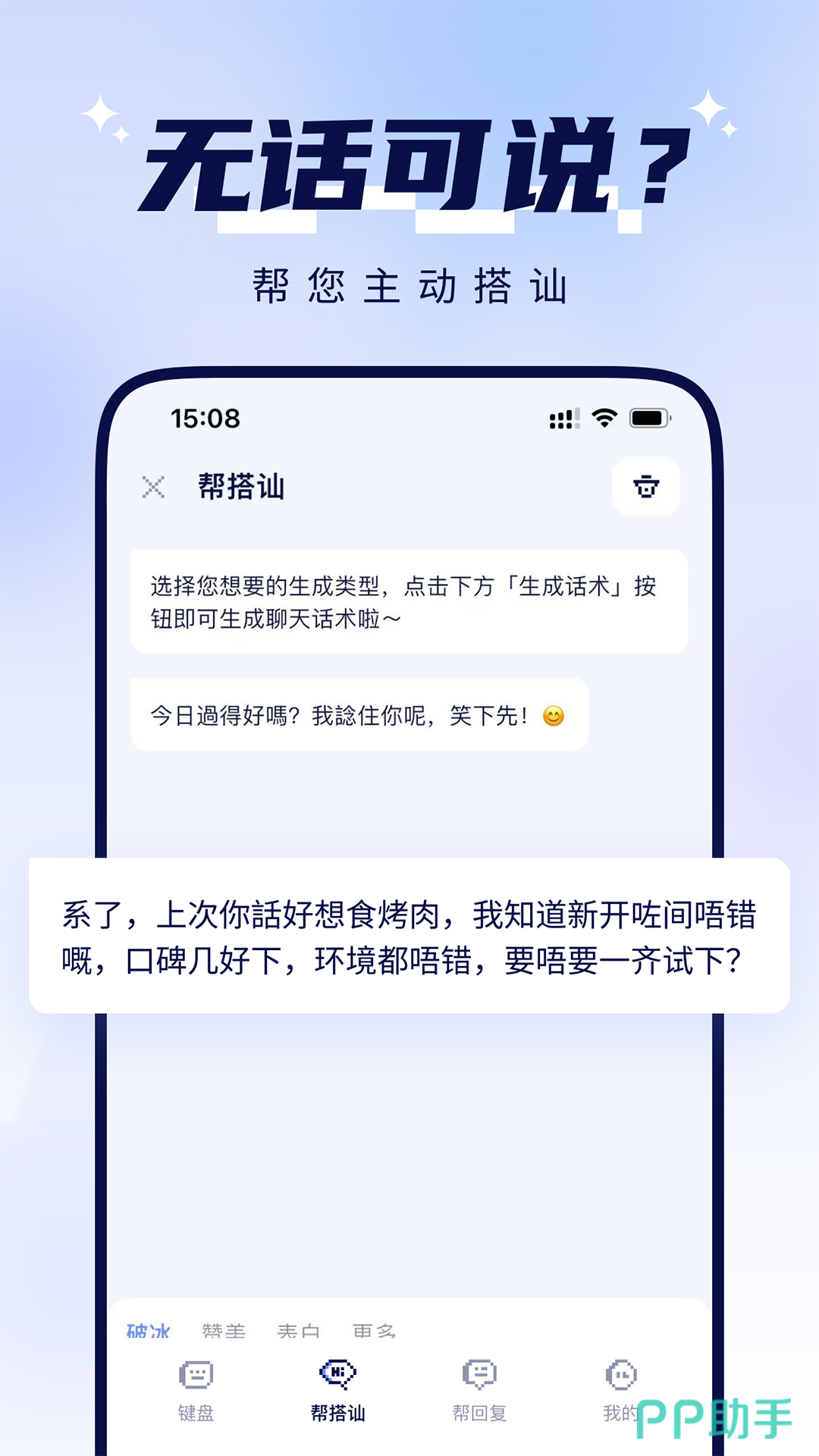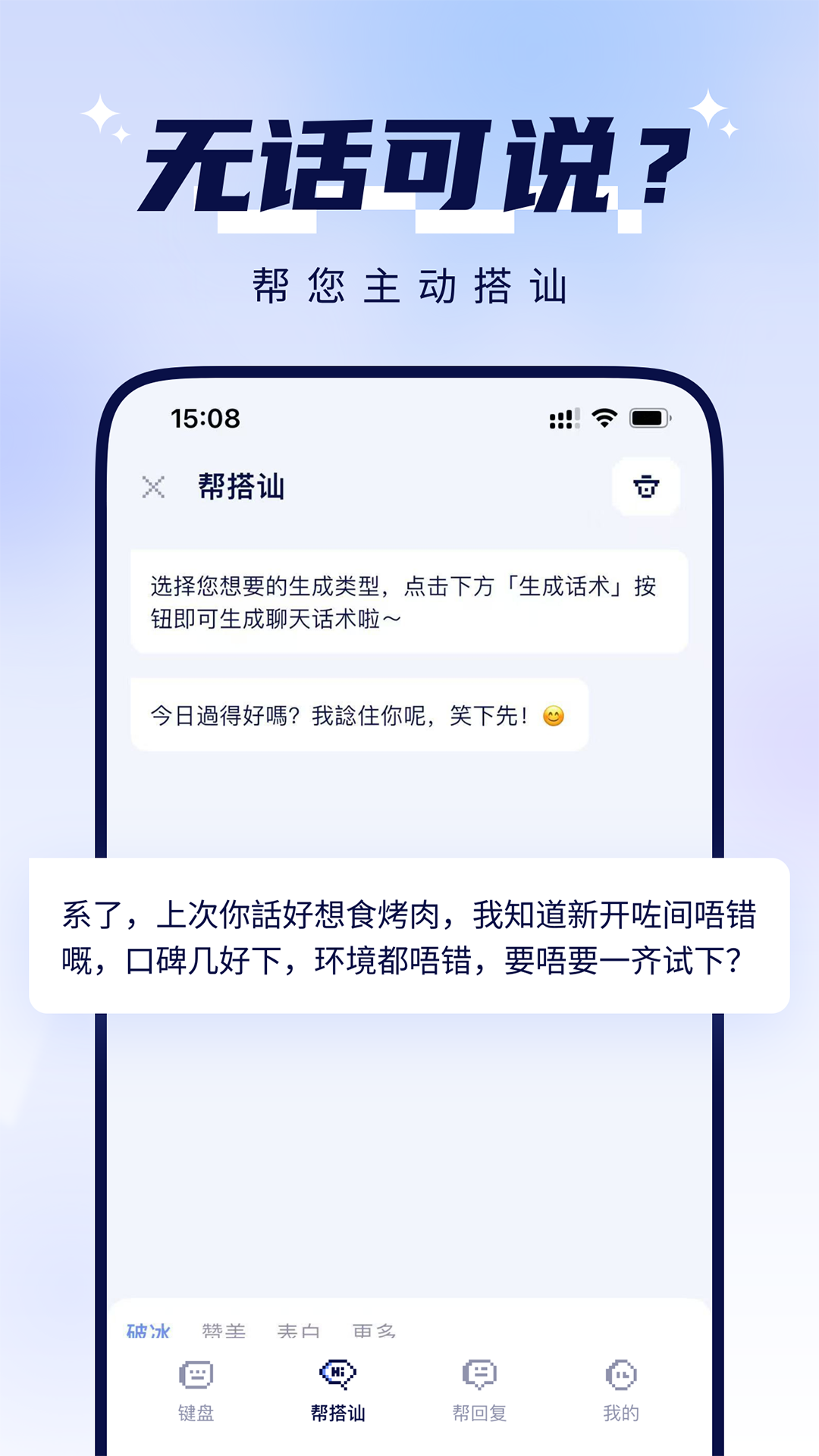 亮点就是普通话转粤语功能,不管你输入的是普通话文字,还是直接说普通话,就可立马换成超级地道地粤语呢,从此再也不怕和粤语区朋友沟通不了!还有高情商回复功能哦,轻松助你打破冷场。